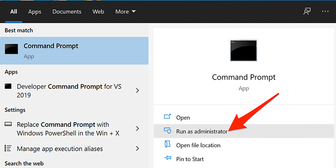 - メニューにアクセスする お気軽にご連絡ください、および検索 コマンドプロンプト、を選択します 管理者として実行..