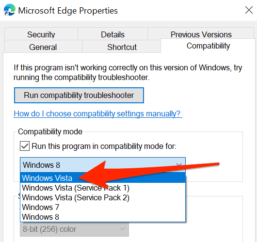 - チェックボックスの下のドロップダウンリストを選択します。このドロップダウンリストに Windows 95 一番上で選択したアプリケーションは32ビットです。ドロップダウンリストが Windows Vistaのアプリケーションは 64 ビットです。