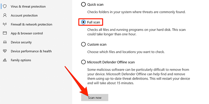 - オプションを選択 フルスキャン 次に、 今スキャンして 一番下に。
