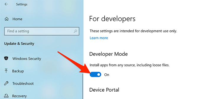 - 右側で、スイッチをオンにします。 開発者モード.