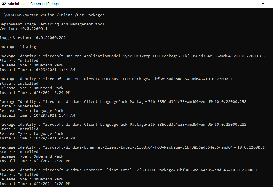 「パッケージ名」という単語を実際のパッケージ名(パッケージID)に置き換えてください。Windowsからコマンドプロンプトを使用している場合は、/Image:Cを使用するすべてのコマンドに/Onlineパラメータを使用する必要があります。