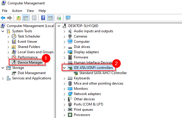 - 見つける デバイスマネージャ 右側から左側に移動し、隣にある小さな矢印を選択します。 IDE ATA / ATAPIコントローラ.
