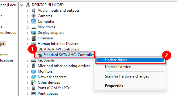 - 右クリック 標準のSATA AHCIコントローラ 選択します ドライバの更新.