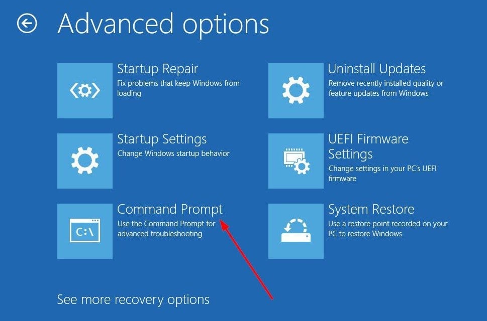 - 自動修復モードから、 詳細オプション > 解決します > 詳細オプション > コマンドプロンプト.