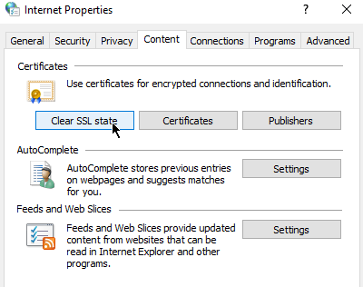 Windows(およびChrome)のSSLステータスをクリアするには、 インターネット設定 (スタートをクリックして、 インターネットオプションタブ内 コンテンツ、。ボタンをクリックします SSLステータスをクリアその後、Chrome を再起動します。