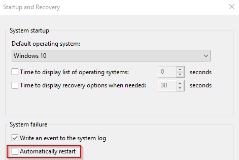 別のウィンドウが表示されます。検索 自動的に再起動 以内に システム障害 オプションの選択を解除します。