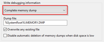 下にスクロールして デバッグ情報を書き込むドロップダウンメニューを使用して選択してください 完全メモリダンプ.