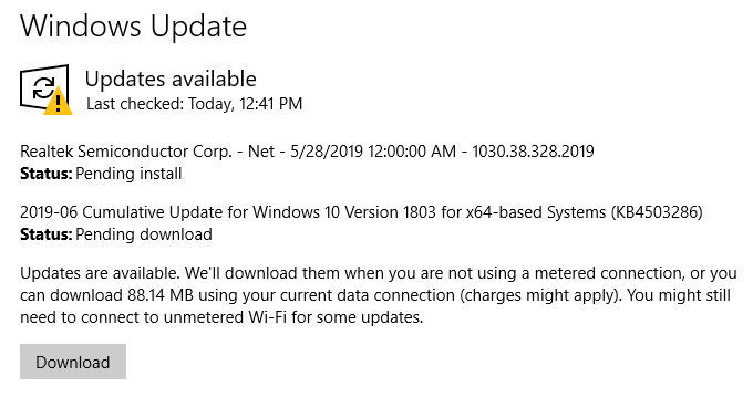 ملاحظة: 保留中のダウンロードがある場合は、「更新を確認」がボタンに置き換えられます。 ダウンロード制限されたインターネット接続を使用している場合は確認が必要です。