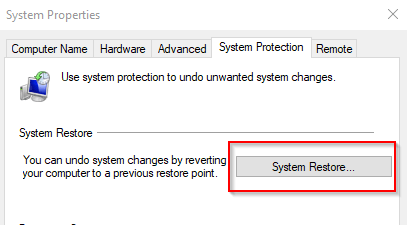 これにより、ウィンドウが開きます システムのプロパティ。タブをクリックします システム保護 をクリックします システムの復元.