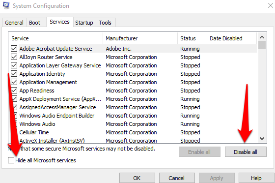 問題を診断するには、クリーン ブートを実行し、問題の原因となっているサービスが見つかるまで、一度に 1 つのサービスを有効にします (その後、再起動します)。