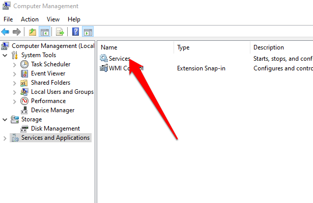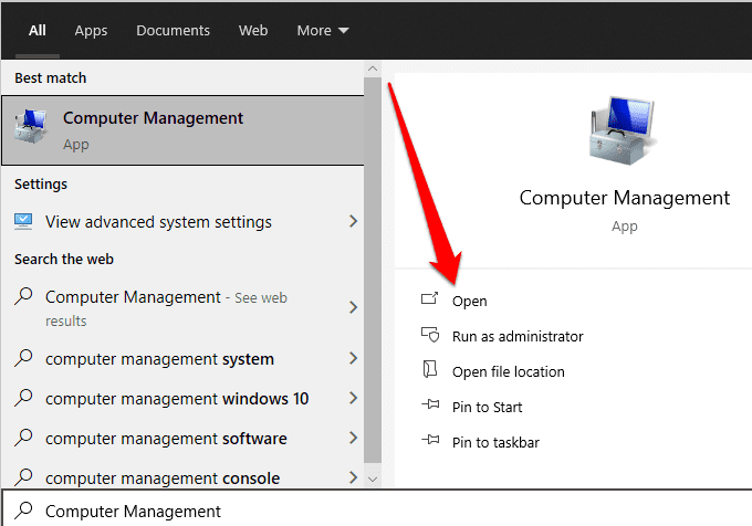 - タイプ コンピュータ管理 タスクバーの検索ボックスで、 開ける 検索結果のコンピュータ管理の下にあります。