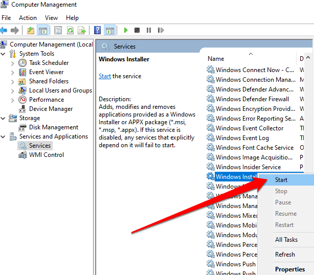 - 右クリック Windowsインストーラ 詳細セクションで、 始める.