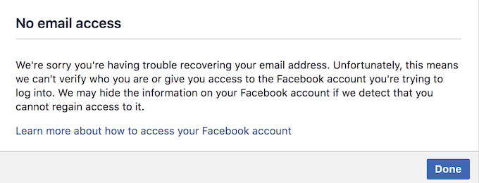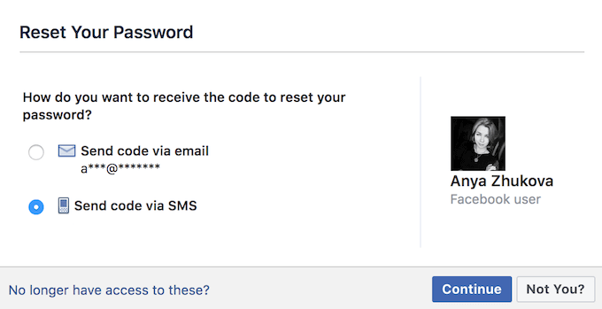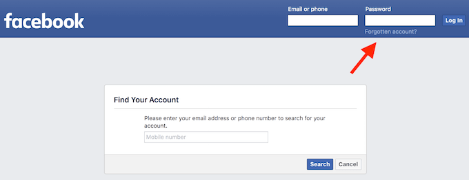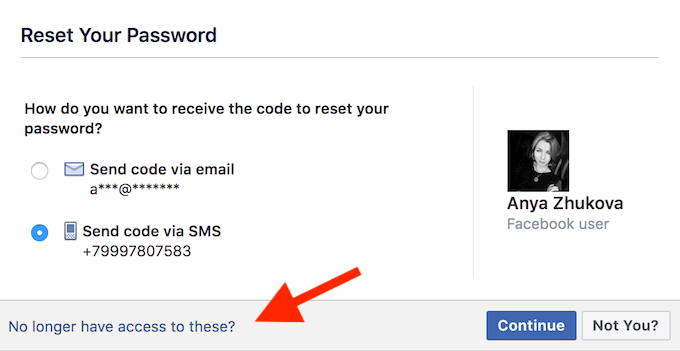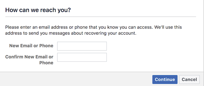 最初のオプションは、メールアドレスまたは電話番号を入力することです。どちらかがアカウントにリンクされている場合は、Facebookから確認コードが送信され、パスワードを簡単にリセットして再度ログインできるようになります。