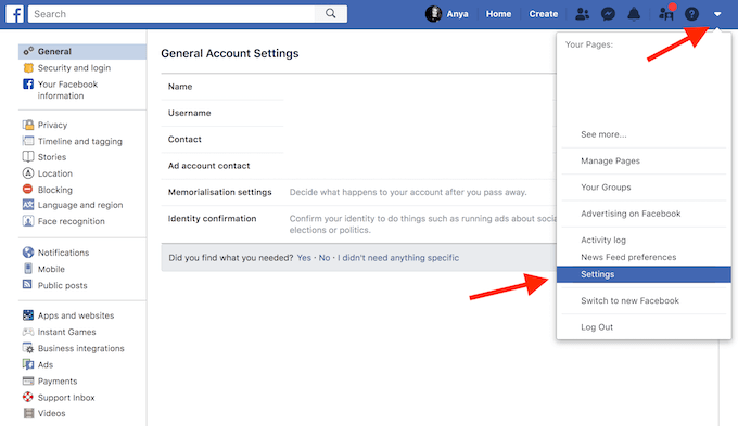 - Facebookでは、画面の右上隅にあるドロップダウン矢印をクリックして、 設定 (設定)。