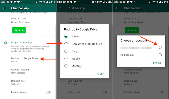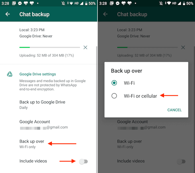 - 「チャットバックアップ」セクションで、下にスクロールしてバックアップをカスタマイズします。 バックアップオーバーオプションに切り替えることができます Wi-Fiまたは携帯電話オプションを有効にすることができます 動画を含める 動画もバックアップします。