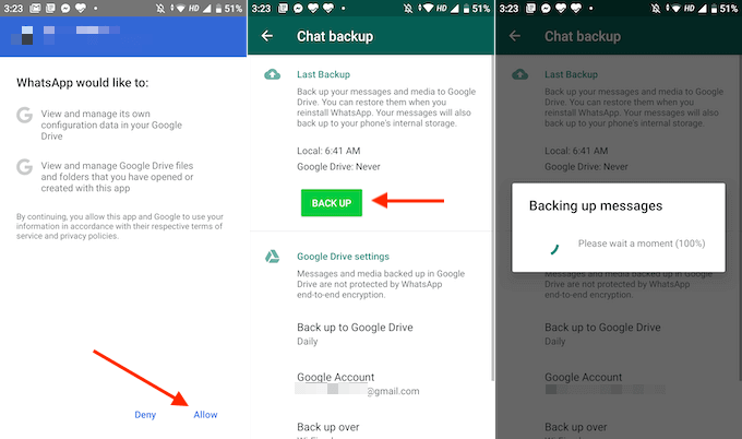 - 次の画面でボタンをクリックします 許可する WhatsApp アカウントを Google ドライブにリンクします。