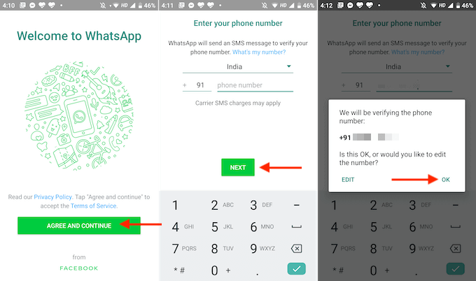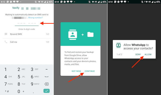 - WhatsAppから確認SMSメッセージが送信されます。アプリがメッセージアプリにアクセスできる場合、プロセスは自動的に完了します。アクセスできない場合は、確認コードを手動で入力する必要があります。