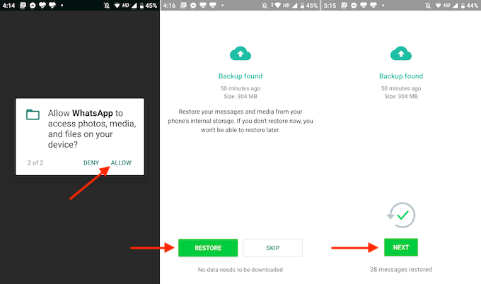 - WhatsAppはローカルストレージまたはGoogleドライブからバックアップを検索します。最新のバックアップが見つかると、画面に詳細が表示されます。WhatsAppの仕組み上、「今すぐデータを復元」を選択する必要があります。セットアップが完了すると、アプリを再インストールしないとデータを復元できなくなります。