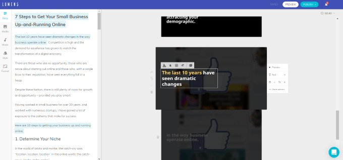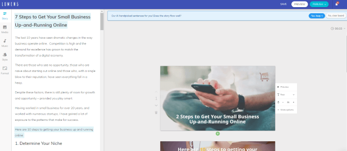 URL を入力すると、Lumen5 は人工知能 (AI) を使用して文章 (強調表示されたテキストを参照) と画像を選択します。