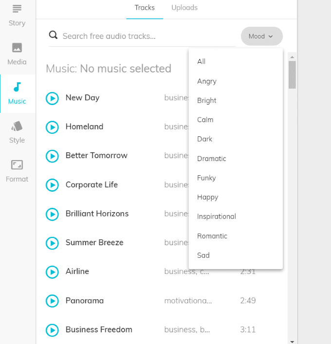 Lumen5では、著作権フリーのオーディオファイルのライブラリにアクセスできます。また、ご自身のファイルをアップロードすることもできます。 音楽 左側にあるナビゲーション領域から。