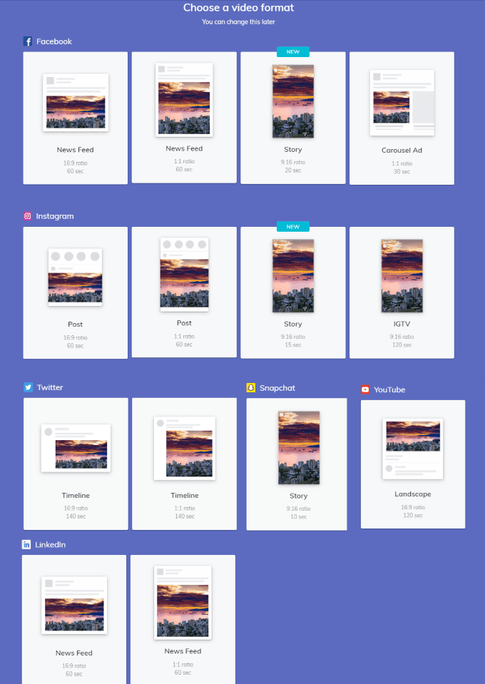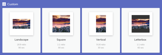 クリックすると ビデオを作成する使用するソーシャルメディア形式またはカスタム形式を選択するオプションが表示されます。または、この手順をスキップすることもできます。