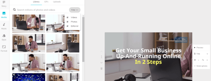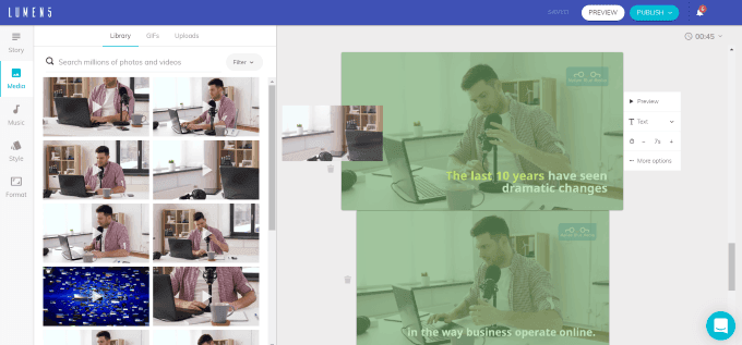 Lumen5 は、ビジネスを宣伝するための魅力的で魅力的なプロフェッショナルなビデオを作成するのに役立つ幅広いオプションと機能を提供します。