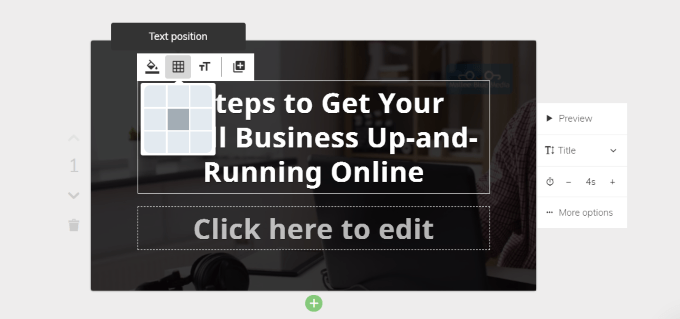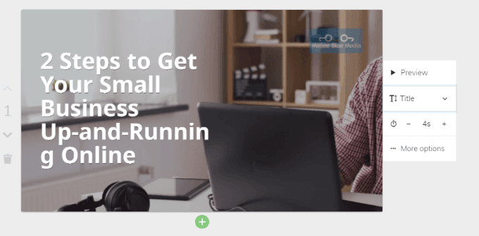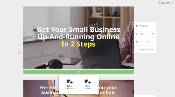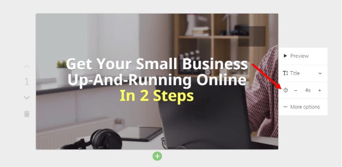 Lumen5は各スライドの再生時間を自動的に設定しますが、変更することも可能です。時間アイコンを見つけて、プラス記号またはマイナス記号をクリックすると、スライドの再生時間を調整できます。