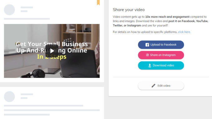 ダッシュボードに戻り、完成した動画をクリックします。その後、Facebookにアップロードしたり、Instagramで共有したり、パソコンにダウンロードしたり、変更したい場合は編集したりできます。