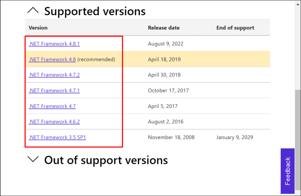 - 訪問 .NET Framework のダウンロード ページ Microsoftのウェブサイトで、「サポートされているバージョン」ドロップダウンメニューセクションを展開し、コンピューターにインストールする.NET Frameworkのバージョンを選択します。
