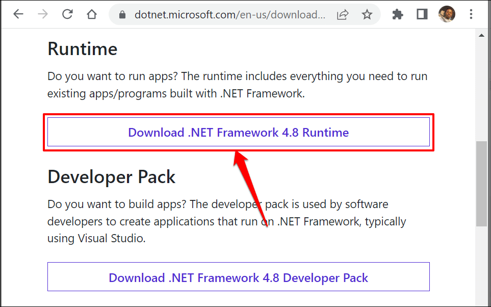 - 「ランタイム」セクションに移動し、「.NET Framework ランタイムのダウンロード」を選択して Web インストーラーをダウンロードします。