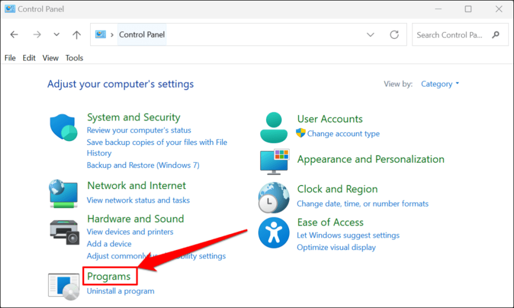 - コントロールパネルを開く プログラム(またはプログラムと機能)を指定します。
