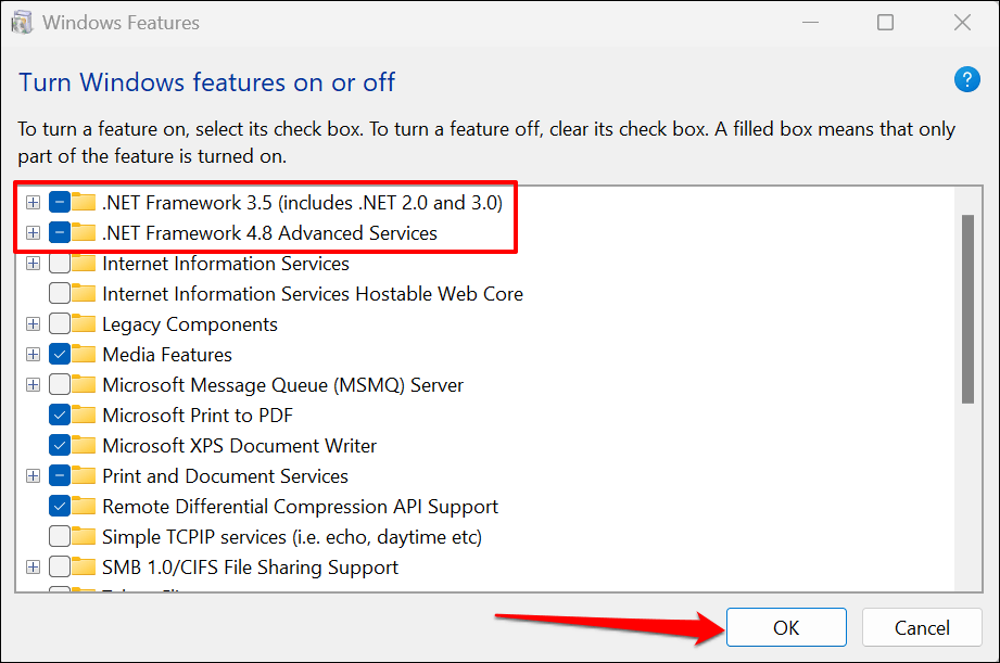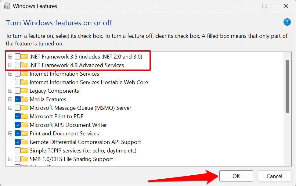 - コントロールパネルを開き、先ほど無効にした.NET Frameworksの横にあるチェックボックスをオンにします。「OK」を選択して続行します。