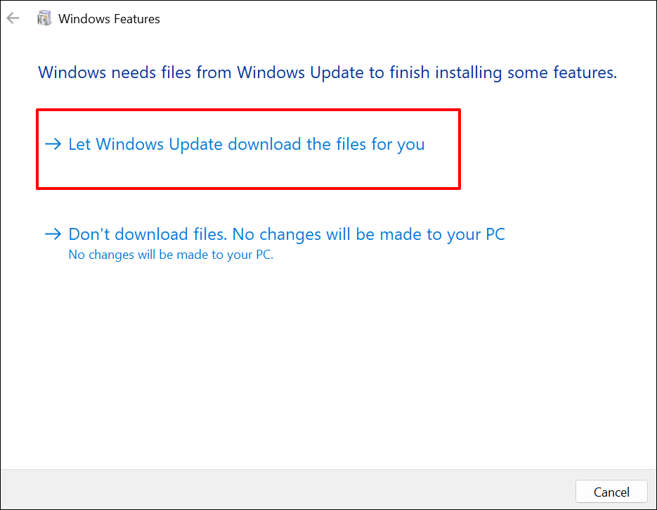 - .NET Framework のセットアップを完了するために、Windows Update からファイルをダウンロードするように求めるプロンプトが表示される場合があります。コンピューターをインターネットに接続し、「Windows Update によるファイルのダウンロードを許可する」を選択してください。