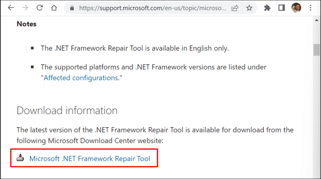 - 「ダウンロード情報」セクションに移動し、Microsoft .NET Framework 修復ツール リンクを選択してファイルをダウンロードします。