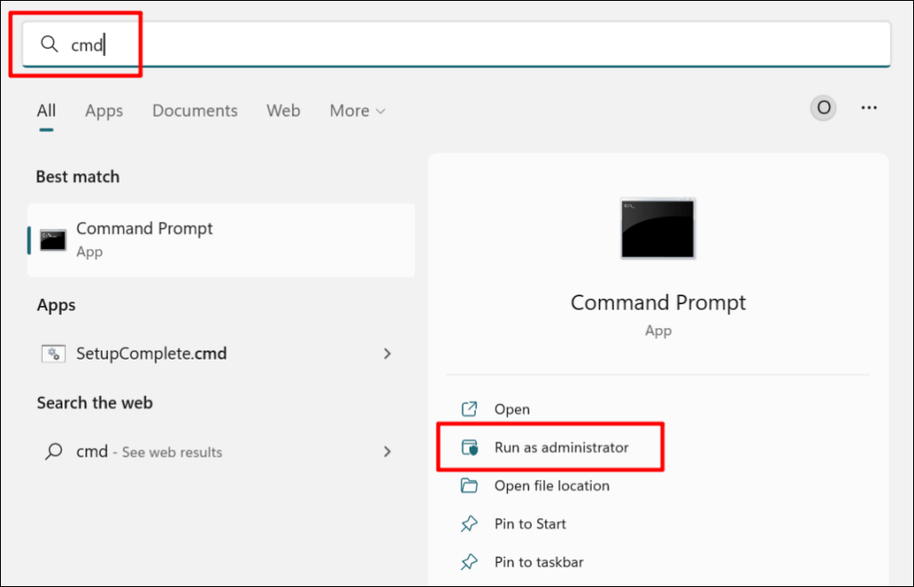 - Windows 検索バーに「cmd」と入力し、コマンド プロンプト アプリケーションを管理者として実行します。