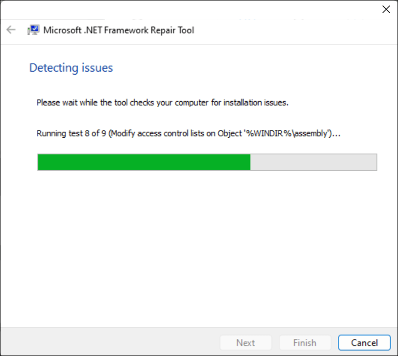 Microsoft .NET Framework 修復ツールがコンピューターをスキャンしてインストールの問題を検出するまでお待ちください。