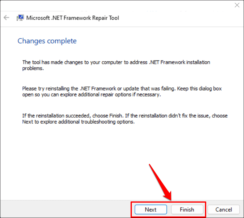 - Microsoft .NET Framework 修復ツールで問題が解決した場合は、「完了」を選択してツールを閉じます。問題が解決しない場合は、「次へ」を選択して、トラブルシューティング修復から「Troubleshoot Plus」をお試しください。