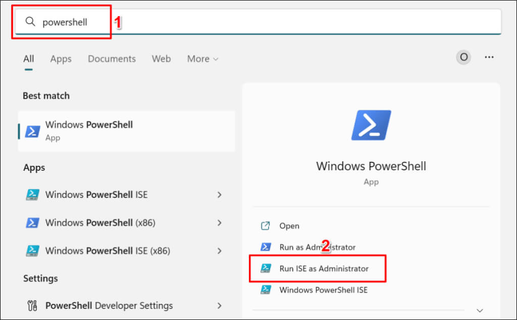 - Windows キーを押して、検索バーに「powershell」と入力し、「ISE を管理者として実行」を選択します。
