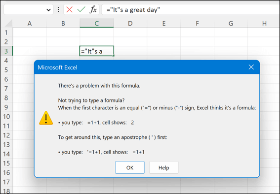 数式に引用符またはアポストロフィが含まれている場合は、一重引用符の代わりに二重引用符を使用することを検討してください。例えば、「=“It's a great day”」ではなく、「=“It””sa great day”」と入力してください。