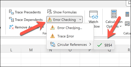 - 数式チェックセクションで、エラー チェック > 循環参照をクリックします。