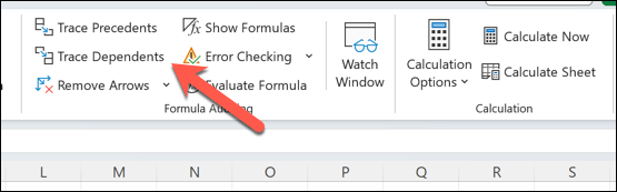 - 「依存関係のトレース」ボタンをクリックします。選択したセルに依存するセルを指す矢印が表示されます。