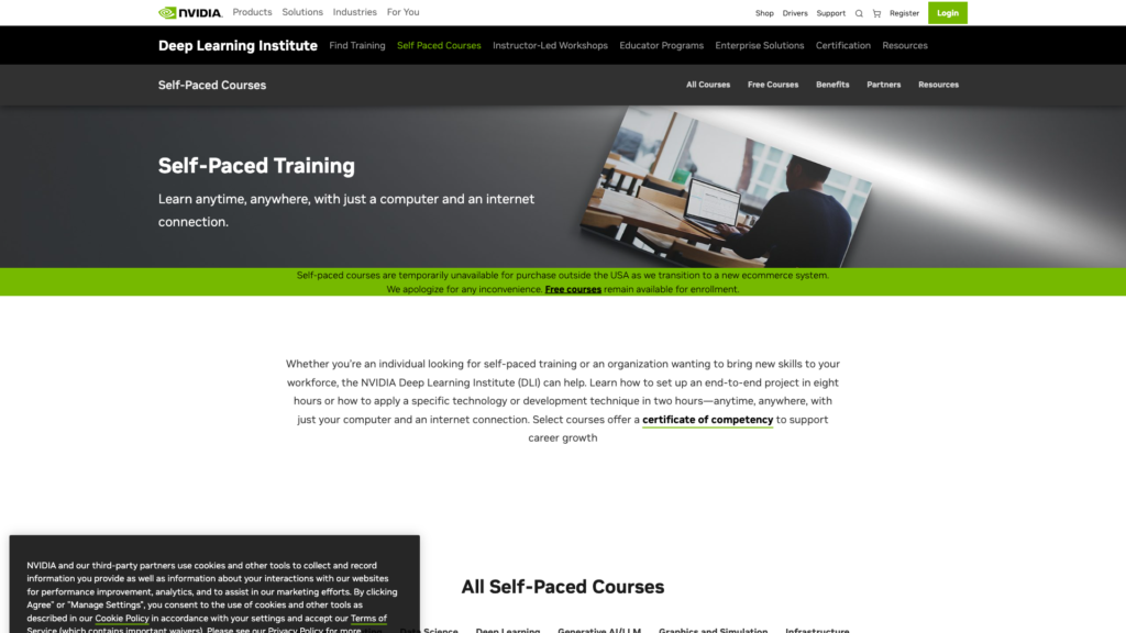 - あなたの写真NVIDIAの無料セルフペースコース(「ディープラーニングの基礎」など)は2時間から8時間で、ディープラーニングやGPUプログラミングといった高度なAIトピックに焦点を当てています。PythonとAIの経験を持つ学習者を対象としており、NVIDIAツールを使用したハンズオンラボを提供しており、最先端のAI開発に最適です。