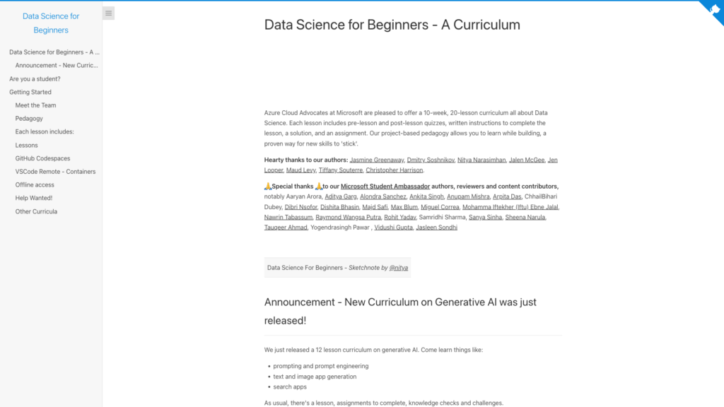 - あなたの写真GitHubは、人工知能(AI)のためのデータサイエンスの基礎概念を紹介する、無料のセルフペースコースを提供しています。10週間にわたり、データの基礎、Python、可視化、そして基本的な機械学習を網羅します。プログラミング経験の浅い初心者を対象としており、実践的な演習も含まれているため、AIのグラフ化のルーツに興味がある方に最適です。