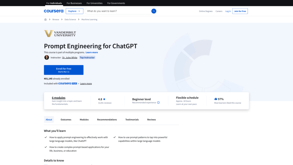 - あなたの写真Courseraの無料復習コースです。ヴァンダービルト大学のジュールズ・ホワイト氏によるこの18時間コースでは、ChatGPTのようなAIモデルにおけるクレームエンジニアリングについて解説します。効果的なクレームの作成方法、出力の最適化、そしてライティングやブレインストーミングといったタスクへの応用方法を学びます。初心者にも優しく、実践的な内容で、事前の技術スキルは必要ありません。