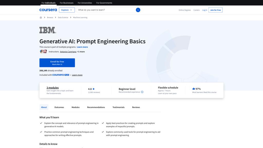 - あなたの写真IBMは、データサイエンスと人工知能(AI)のためのPython入門として、Courseraで25時間のコース(視聴無料)を提供しています。Pythonの基礎、データ構造、PandasやNumPyなどのライブラリ、そして実践的なプロジェクトを学習します。AIタスクにPythonを適用したい中級プログラマーに最適です。