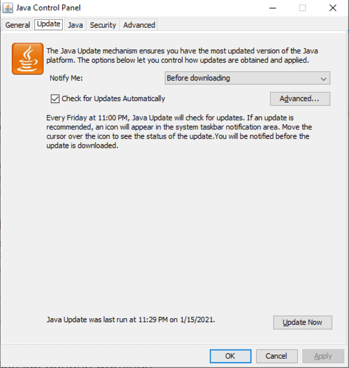 それでも問題が解決しない場合は、Javaを更新してください。これを行うには、 コントロールパネル > プログラム > Java 「アップデート」タブに移動し、下部にある 今すぐアップデート。