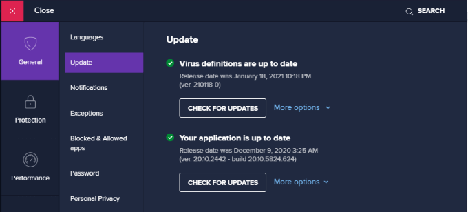 Avastを更新するには、右上隅のメニューアイコンをクリックし、 更新、次に選択します 更新を確認 どちらのオプションもご利用いただけます。これにより、ソフトウェアとウイルス定義の両方が最新の状態に保たれます。