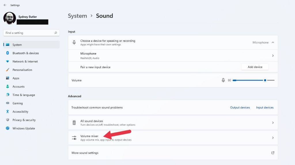 - 次に選択します オーディオミキサー 以内に 高度なセクション.