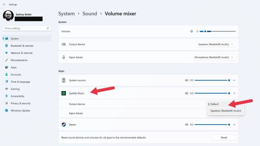 特定のアプリでのみサウンドが再生される場合は、そのアプリが正しいオーディオ出力デバイスに設定されていない可能性があります。アプリを一度閉じて再度開いてみてください。それでも問題が解決しない場合は、アプリが正しい出力デバイスに設定されているかどうかを確認してください。