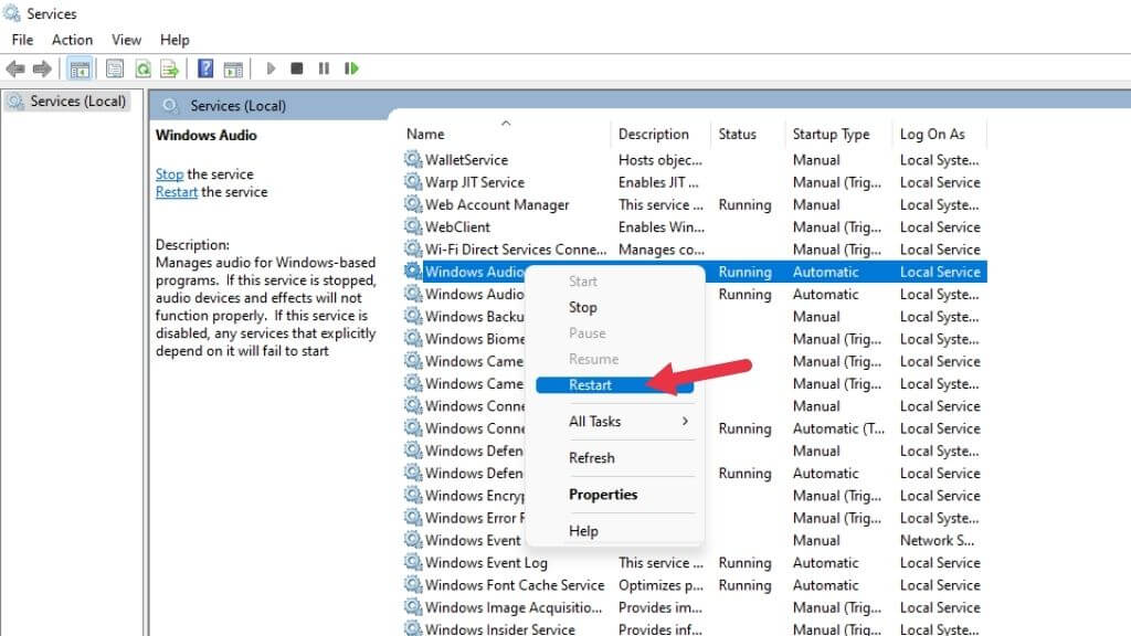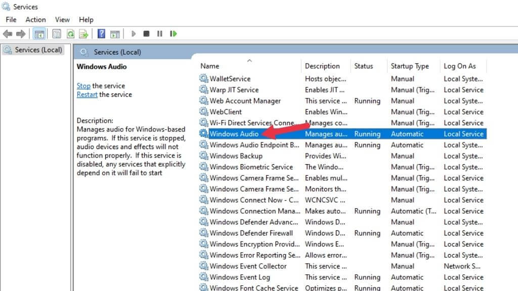 Windows Audioサービスが何らかの理由で動作を停止している可能性があります。これはハードウェア、デバイスドライバー、その他の設定とは関係ない可能性があります。この問題を解決する簡単な方法の一つは、サービスを手動で再起動することです。